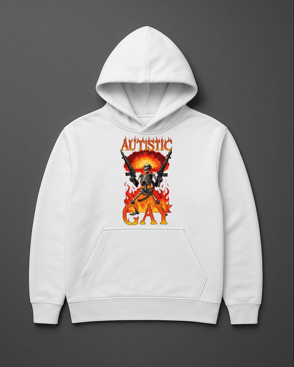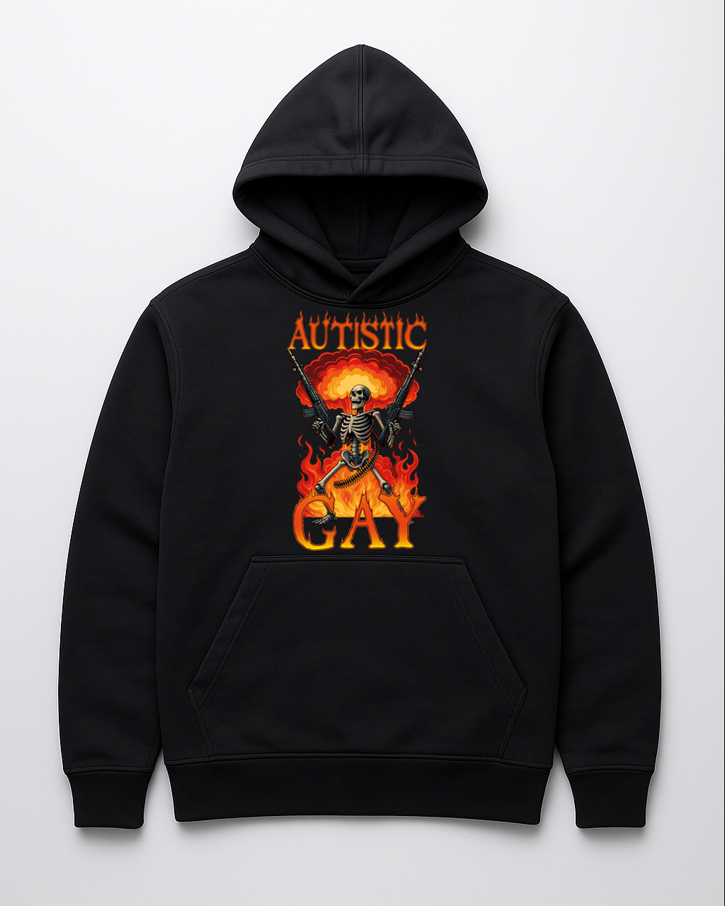 Bluza Autistic Gay to definicja czarnego humoru. Wyjątkowy nadruk z szkieletem  z piekła sprawia, że nikt nie przejdzie obok niej obojętnie. Idealna dla tych, którzy mają autyzm i dodatkowo są gejami. Wysokiej jakości nadruk DTF gwarantuje trwałość – nawet po ostrej randce z kolegą.