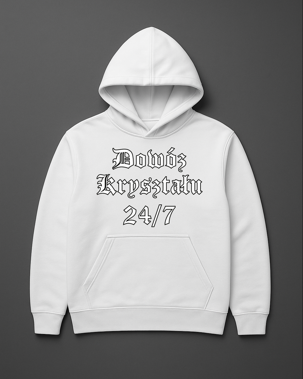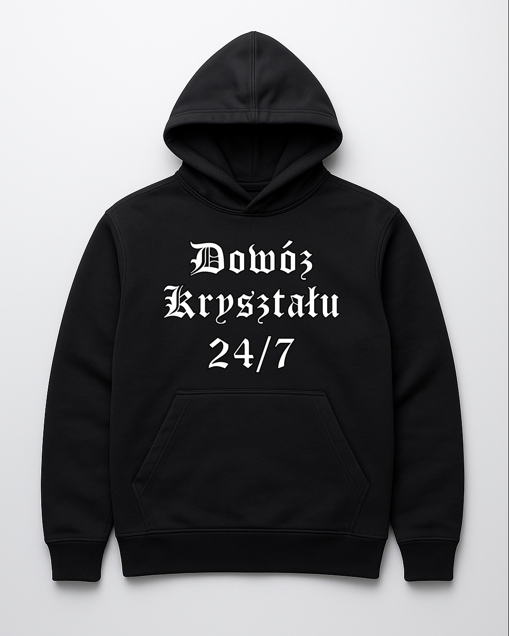Bluza, która wygląda jak ogłoszenie z ciemnej ulicy, ale w rzeczywistości to czysty mem. „Dowóz kryształu 24/7” – tekst tak mocny, że aż sam w sobie brzmi jak punchline. Idealna na melanż, spocik albo każdą sytuację, gdzie chcesz, żeby ludzie zastanawiali się, czy naprawdę serio to nosisz. Druk DTF – wytrzyma więcej niż twoje weekendowe pomysły.