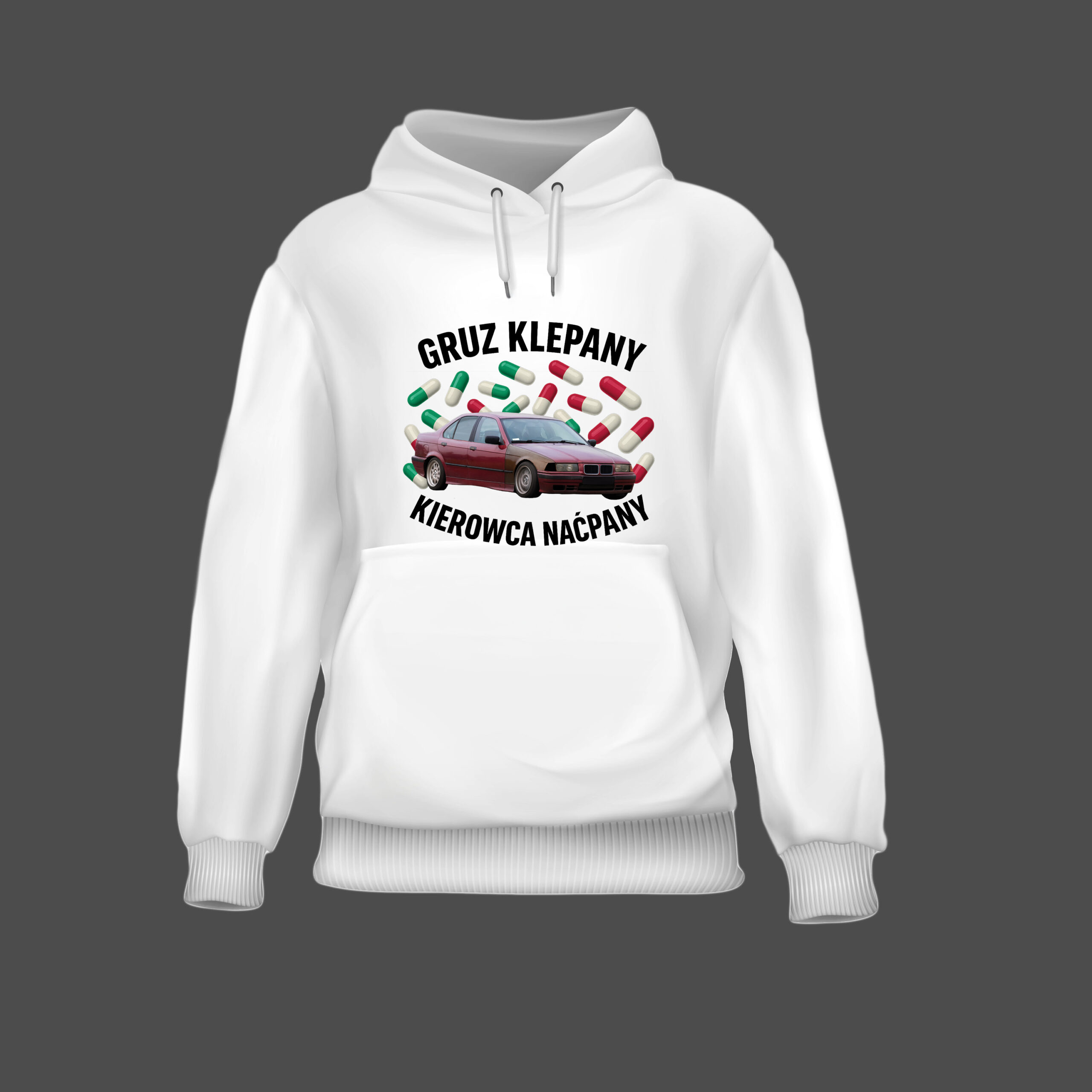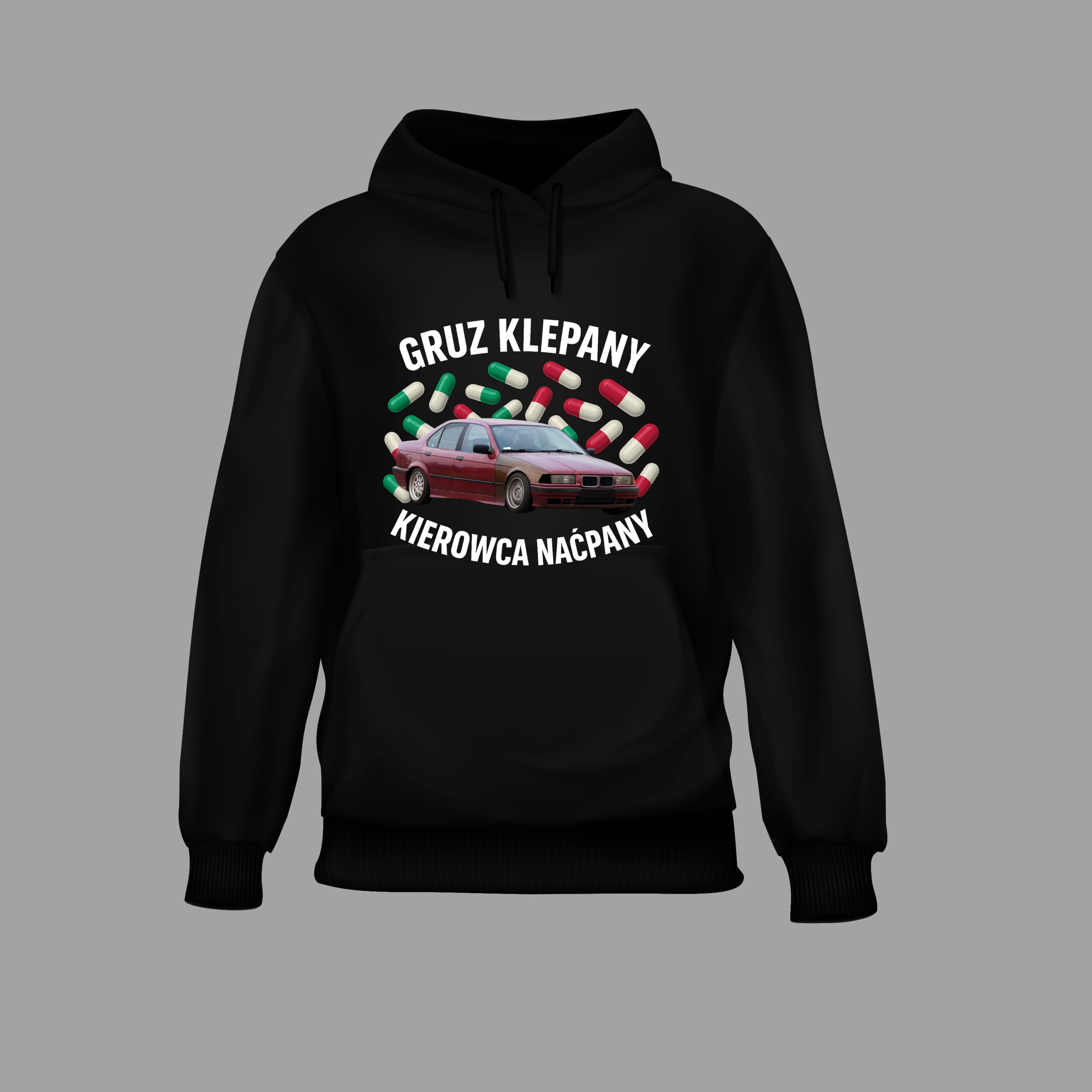 Bluza dla fanów prawdziwej motoryzacji – tej, w której gruz jedzie tylko dzięki sile modlitwy i młotka w bagażniku. Hasło na plecach to czysty vibe spotów, gdzie połowa aut nie ma przeglądu, a druga połowa – hamulców. Druk DTF – nie spierze się, nawet jeśli twoja pralka wygląda jak twoje auto: trzyma się tylko na trytytkach. Idealna na zloty, melanże i każdy dzień, w którym chcesz przypomnieć światu, że „gruz też ma duszę”.
