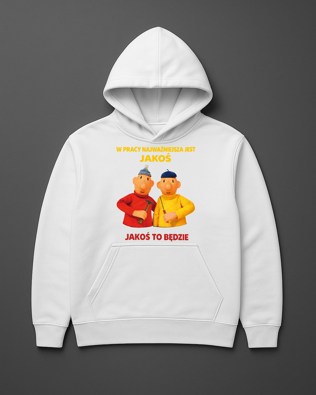 Bluza W pracy najważniejsza jest jakoś – klasyczna życiowa prawda w wykonaniu mistrzów fuszerki, miało być porządnie, wyszło jak zawsze, a i tak jest klepnięte, nadruk DTF trzyma się lepiej niż ich robota i nie puści nawet po wielu praniach.