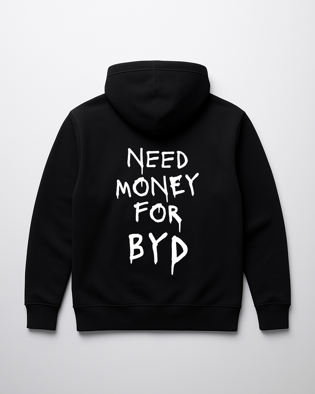 Bluza Need Money For BYD – ironiczny manifest nowoczesnych ambicji dla tych, którzy wiedzą, że przyszłość jeździ na prąd i też kosztuje, prosto w punkt, lekko bezczelnie i bez udawania luksusu, nadruk wykonany trwałym drukiem DTF więc przeżyje więcej niż hype na kolejne modele.
