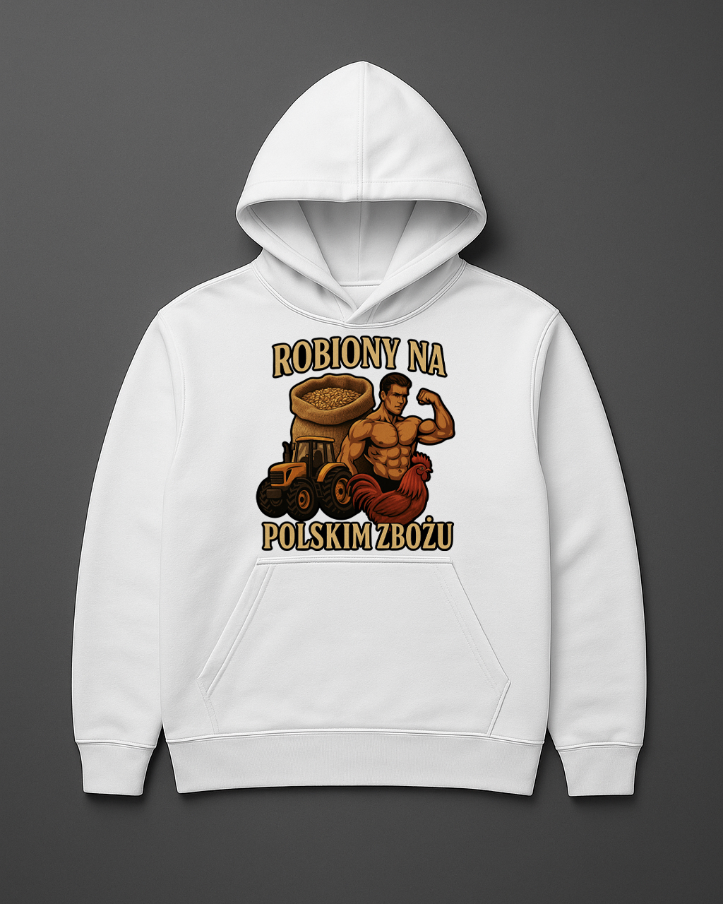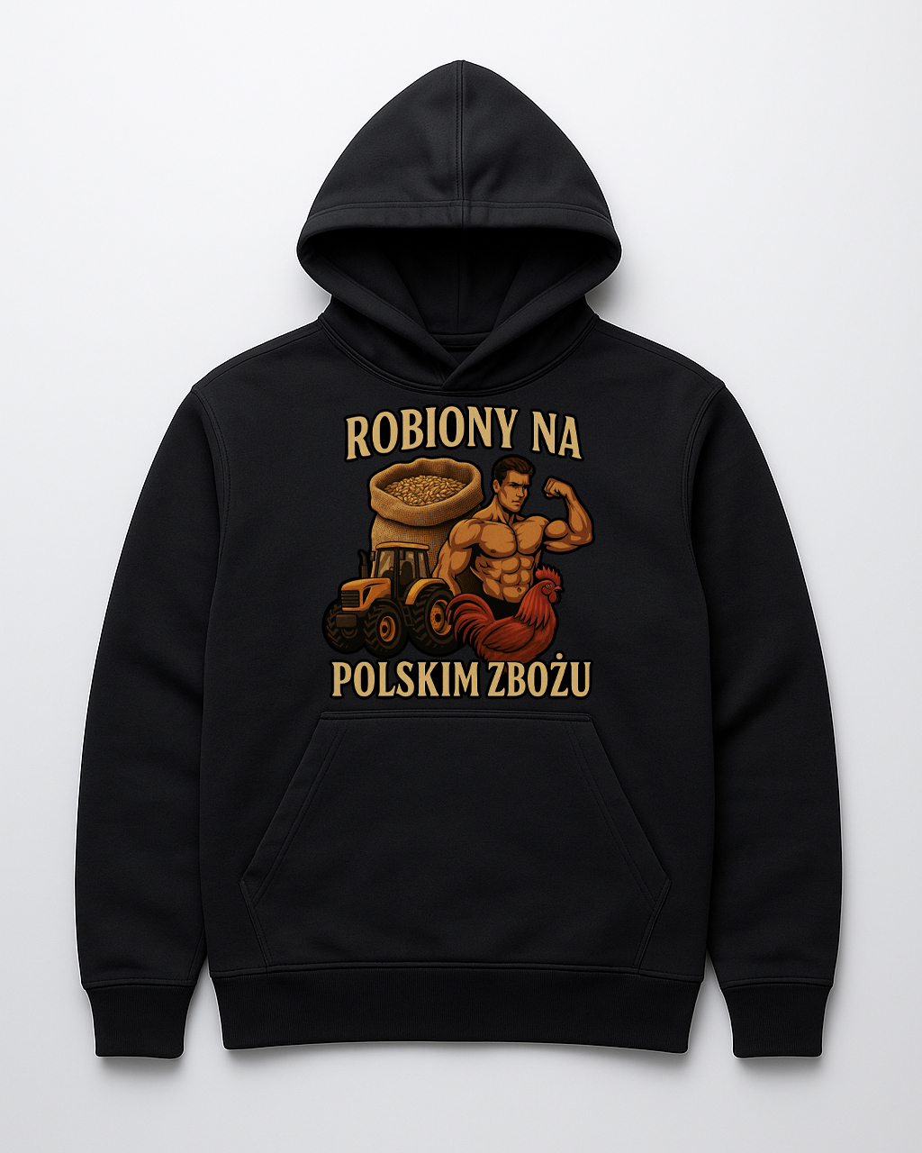 „ROBIONY NA POLSKIM ZBOŻU” – manifest siły, charakteru i zdrowego, swojskiego ego. Bluza dla tych, co mają biceps z pszenicy, serce z żyta i ducha jak kombajn na pełnych obrotach. Wzór, który pachnie świeżym polem, kurzem z traktora i dumą z polskiej roboty.