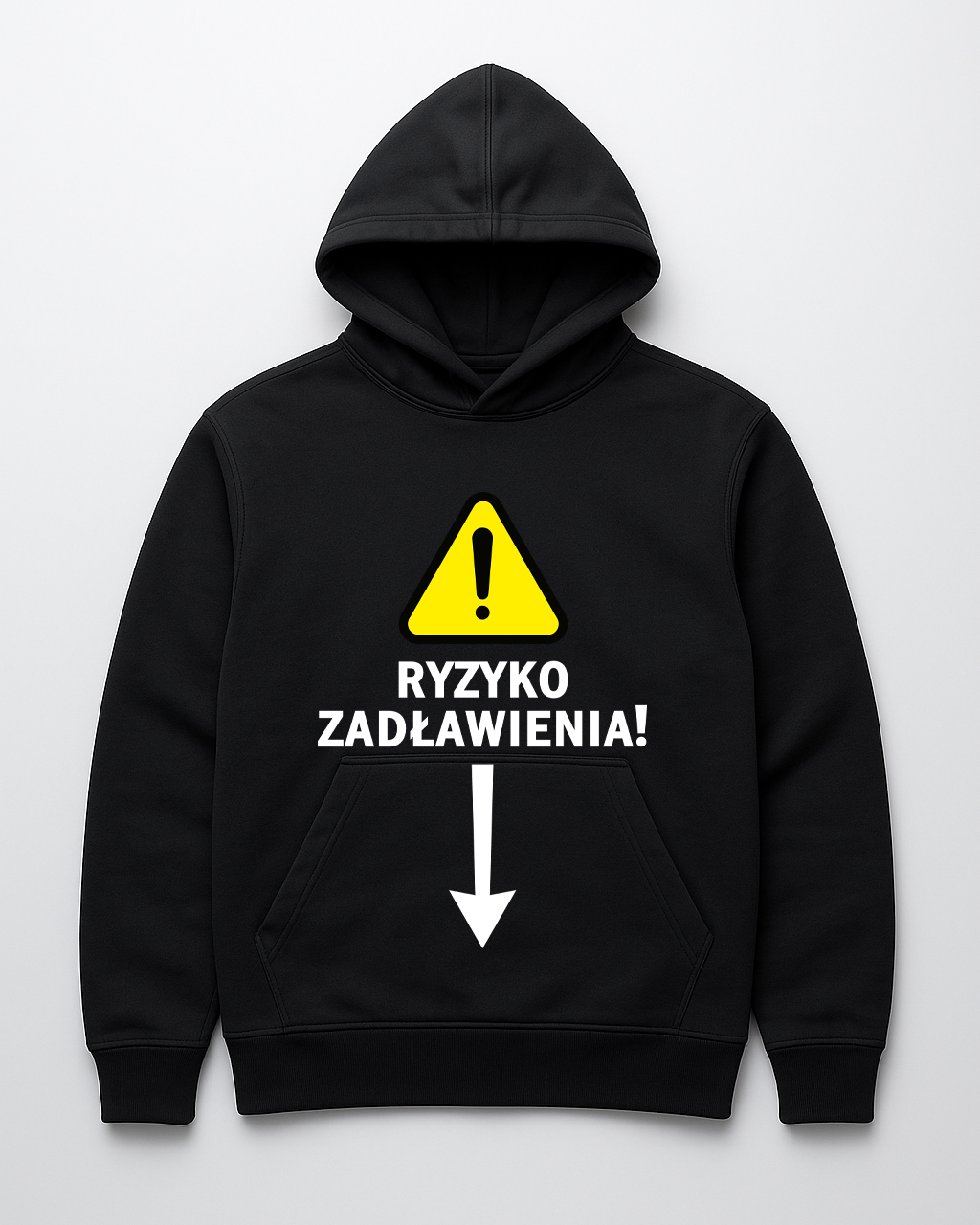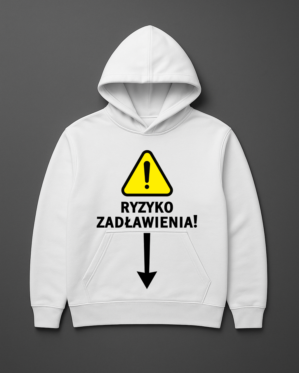 Bluza, która powinna mieć swoją własną homologację. Trójkąt ostrzegawczy i napis „Ryzyko zadławienia!” mówią więcej niż tysiąc słów – i gwarantują, że nikt nie przejdzie obok ciebie obojętnie. Idealna na imprezy, spociki i wszystkie sytuacje, w których chcesz być chodzącym znakiem ostrzegawczym. Druk DTF – wytrzyma pranie, pot i każdą aferę, którą wywołasz nosząc ten wzór.