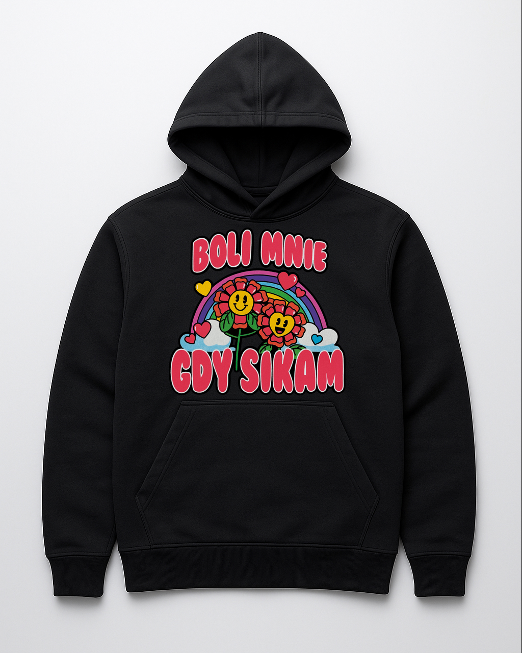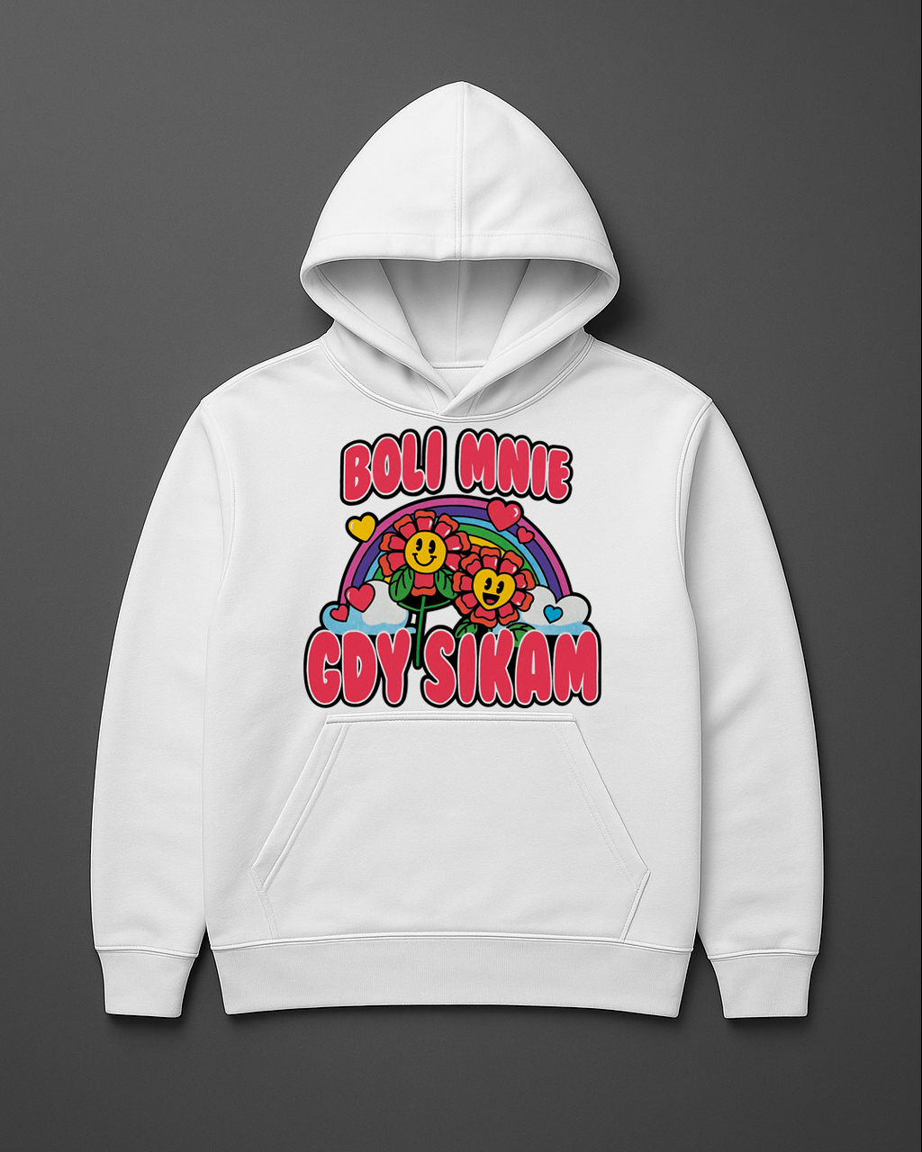 Bluza „Boli mnie gdy sikam” to uroczy kontrast między tęczowym światem kwiatków 🌸🌈 a brutalną szczerością życia. Idealna dla tych, którzy lubią rozbroić ludzi jednym spojrzeniem – połowa się zaśmieje, druga połowa nie będzie wiedziała, jak zareagować. Druk DTF wytrzyma każde pranie i każdą niezręczną rozmowę.