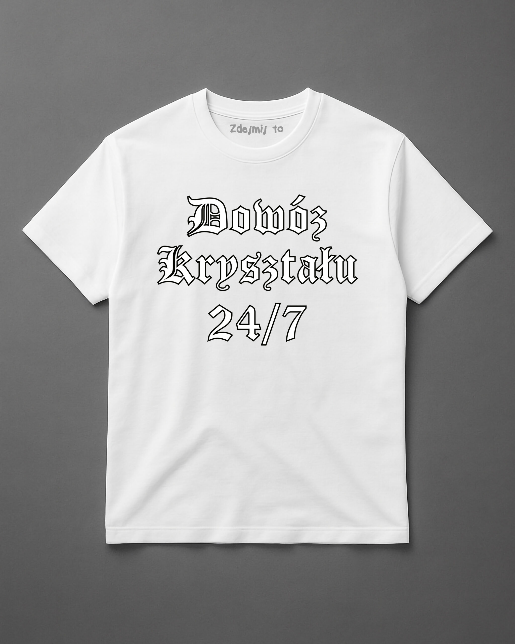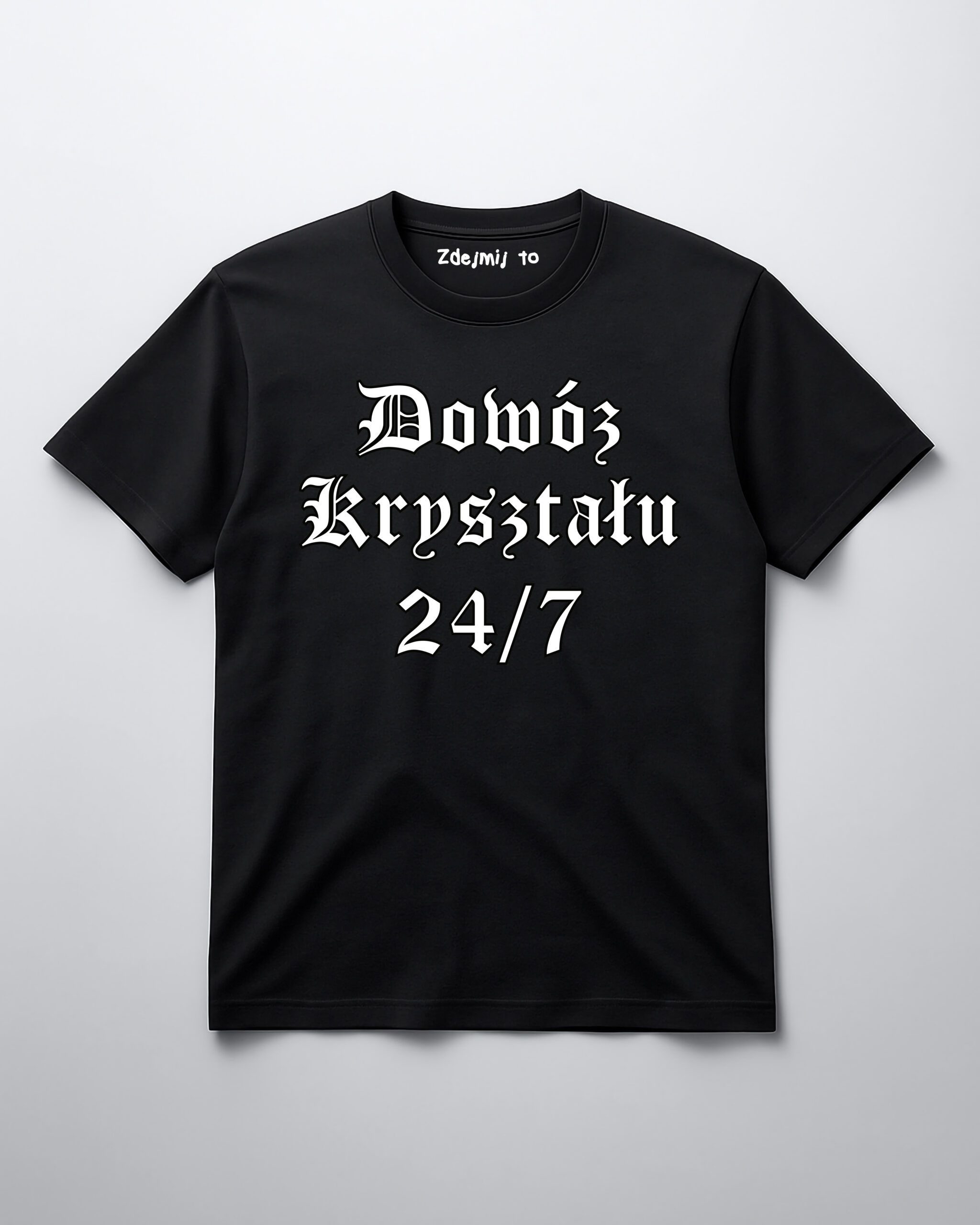 Koszulka, która wygląda jak ogłoszenie z ciemnej ulicy, ale w rzeczywistości to czysty mem. „Dowóz kryształu 24/7” – tekst tak mocny, że aż sam w sobie brzmi jak punchline. Idealna na melanż, spocik albo każdą sytuację, gdzie chcesz, żeby ludzie zastanawiali się, czy naprawdę serio to nosisz. Druk DTF – wytrzyma więcej niż twoje weekendowe pomysły.