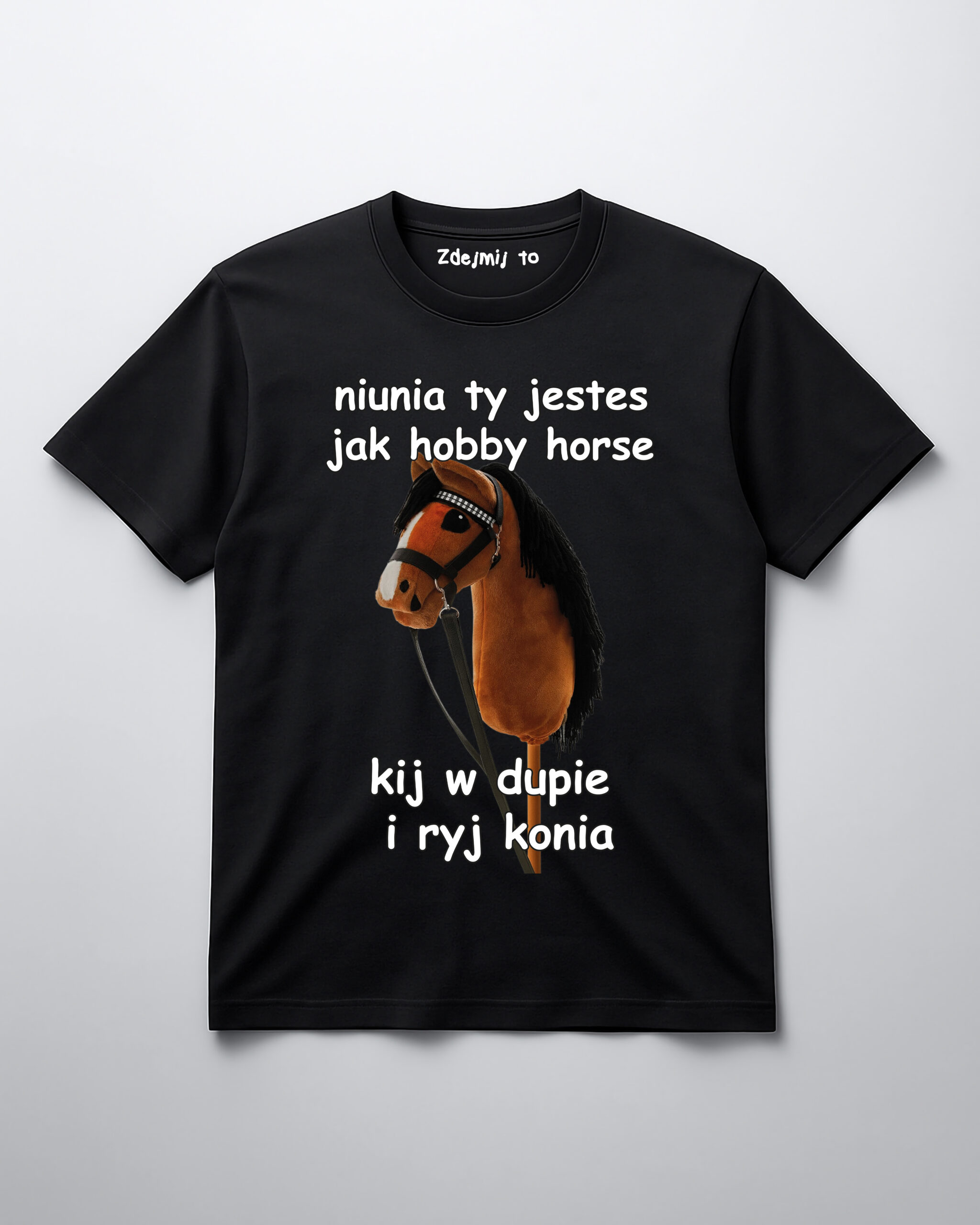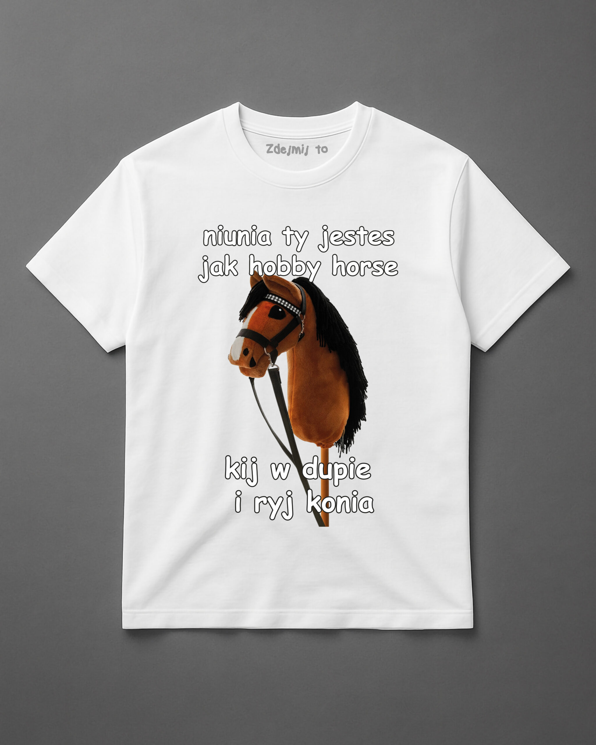 „NIUNIA TY JESTEŚ JAK HOBBY HORSE – KIJ W DUPIE I RYJ KONIA” – koszulka z poziomem ciętej riposty, przy której nawet koń by parsknął. Idealna dla tych, co nie boją się powiedzieć prawdy prosto z mostu, a przy okazji mają poczucie humoru ostrzejsze niż kant stajni.