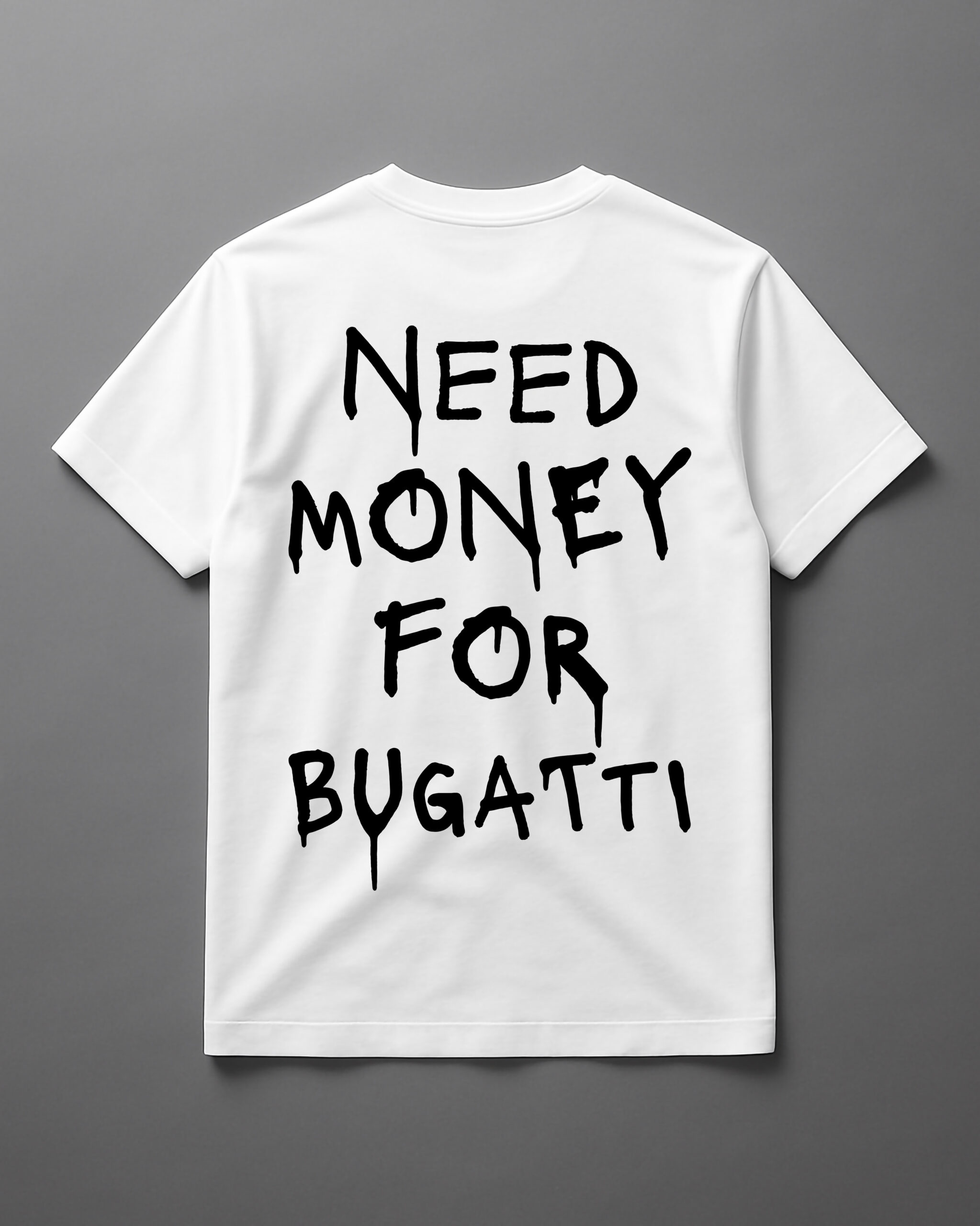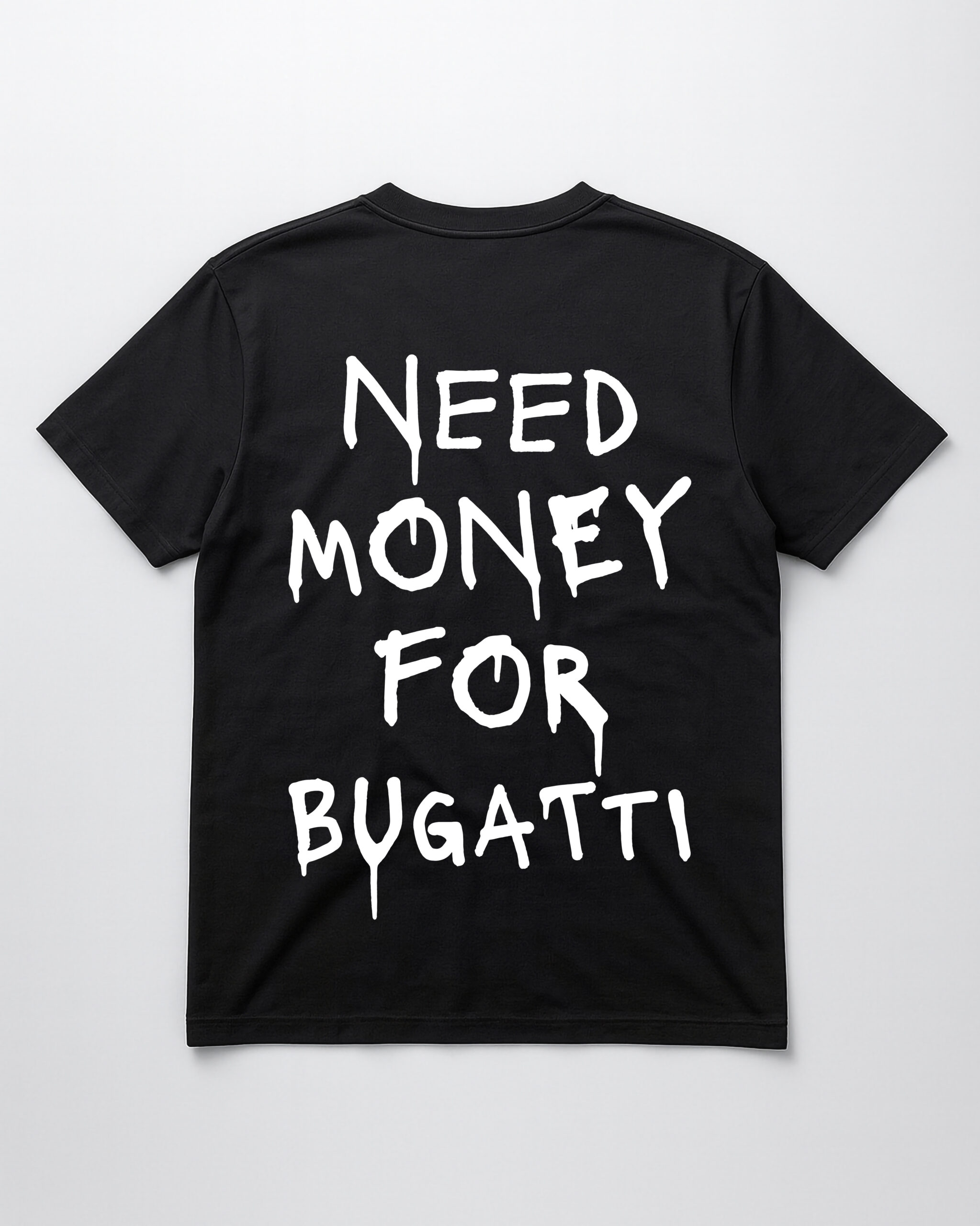 Koszulka Need Money For Bugatti – krótka deklaracja życiowych priorytetów dla ludzi, którzy wiedzą, że marzenia kosztują, a konto samo się nie napełni, absurdalnie szczere, lekko bezczelne i idealne do noszenia z dystansem do siebie, nadruk wykonany techniką DTF więc trzyma się lepiej niż postanowienia po wypłacie i nie znika po kilku praniach.