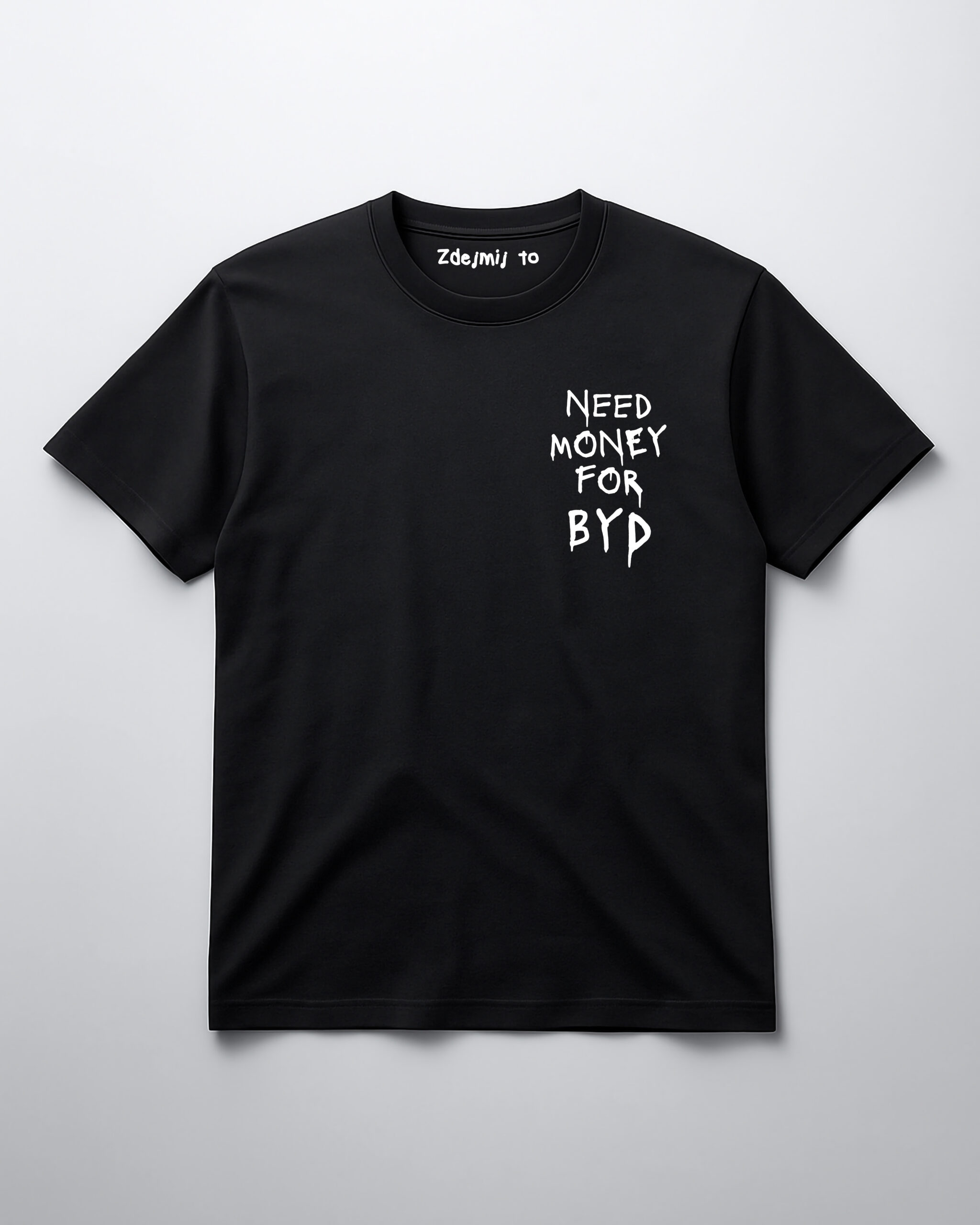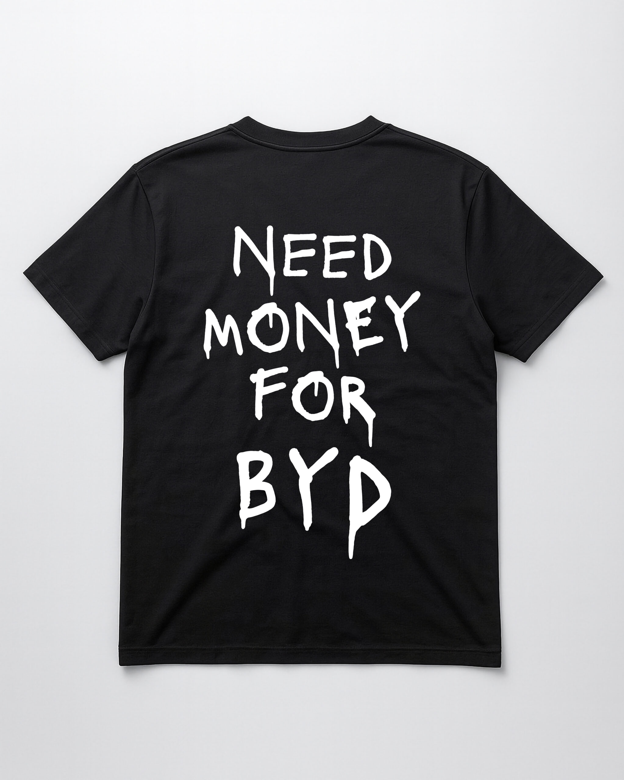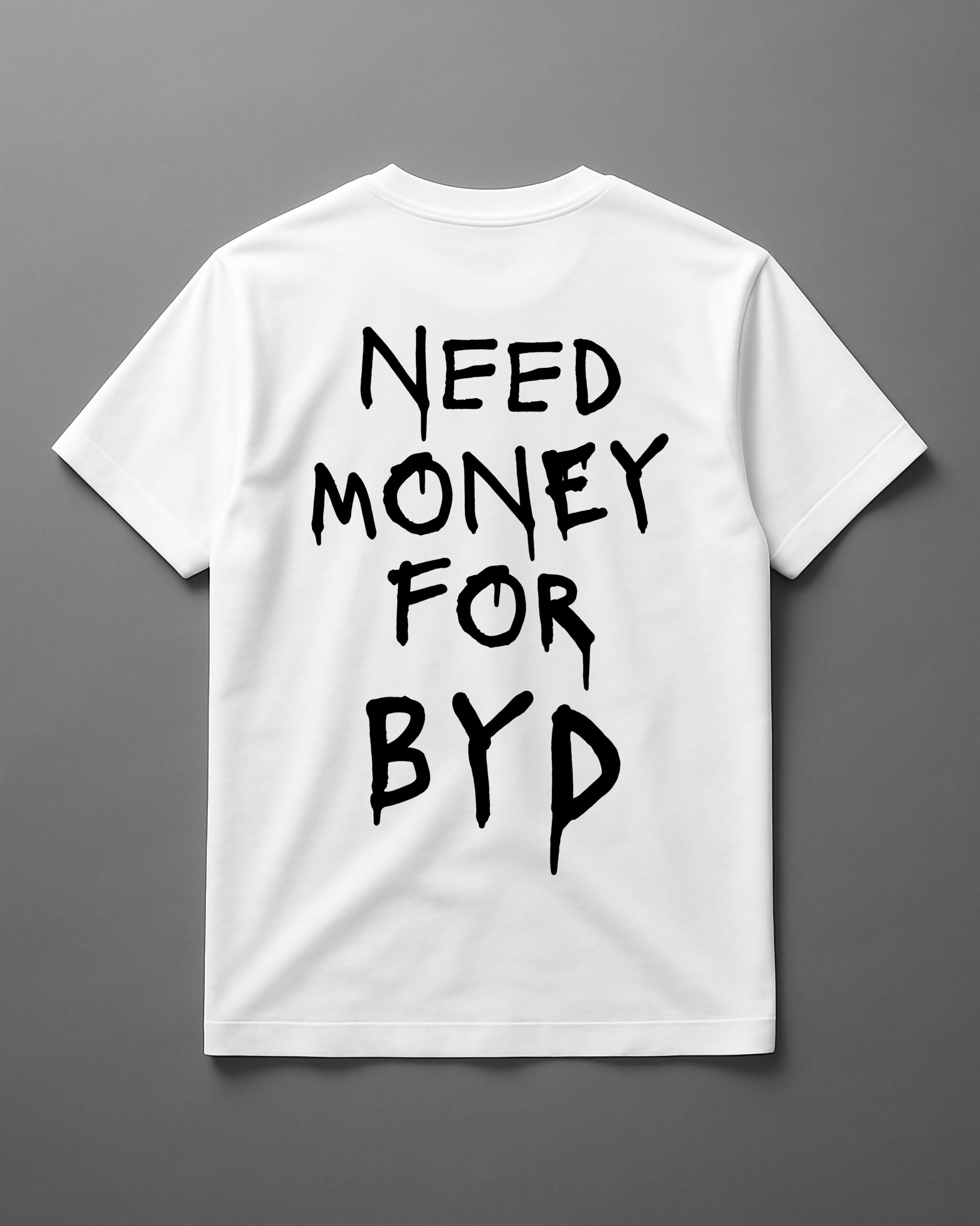 Koszulka Need Money For BYD – ironiczny manifest nowoczesnych ambicji dla tych, którzy wiedzą, że przyszłość jeździ na prąd i też kosztuje, prosto w punkt, lekko bezczelnie i bez udawania luksusu, nadruk wykonany trwałym drukiem DTF więc przeżyje więcej niż hype na kolejne modele.