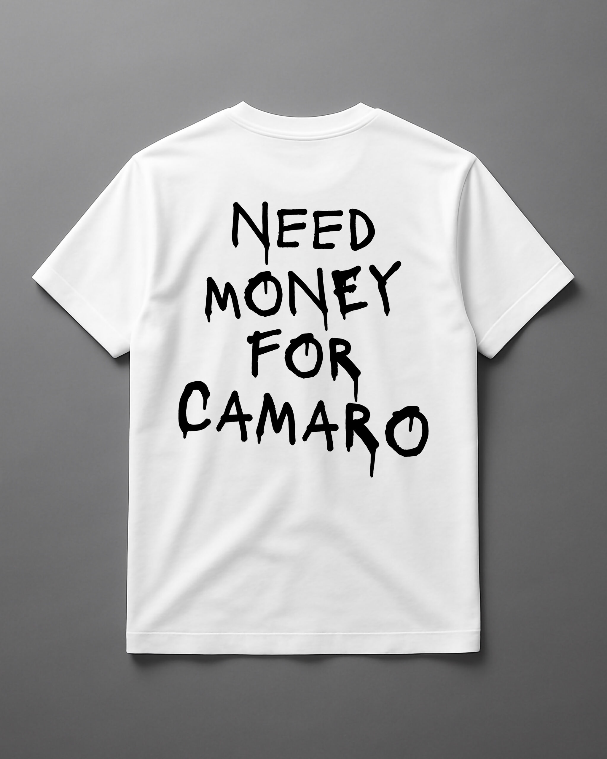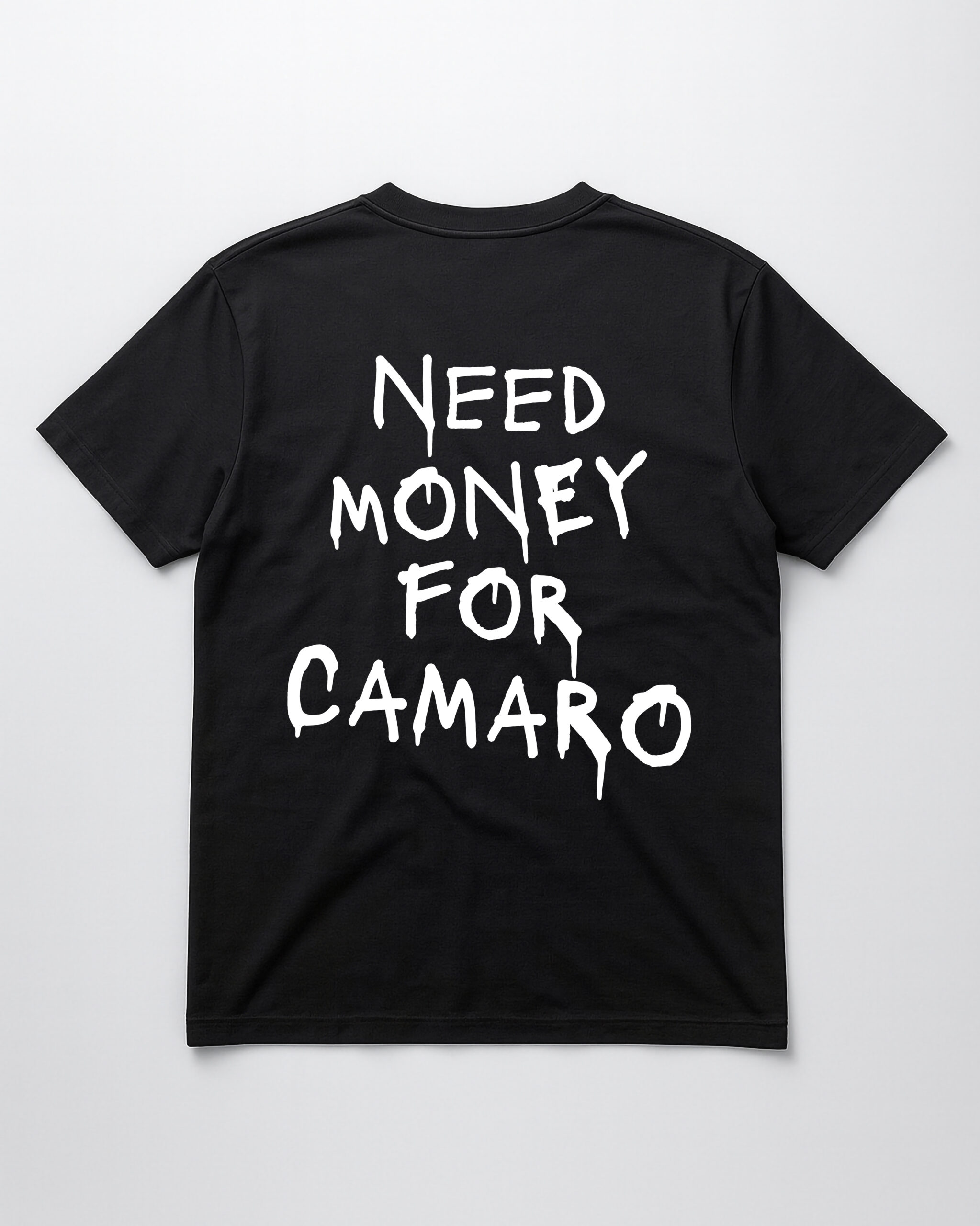 Koszulka Need Money For Camaro to krótki, ironiczny przekaz dla fanów muscle carów, wyrazisty nadruk wykonany trwałą techniką druku DTF zachowuje ostrość i jakość nawet po wielu praniach i jasno pokazuje motoryzacyjne ambicje oraz dystans do siebie.