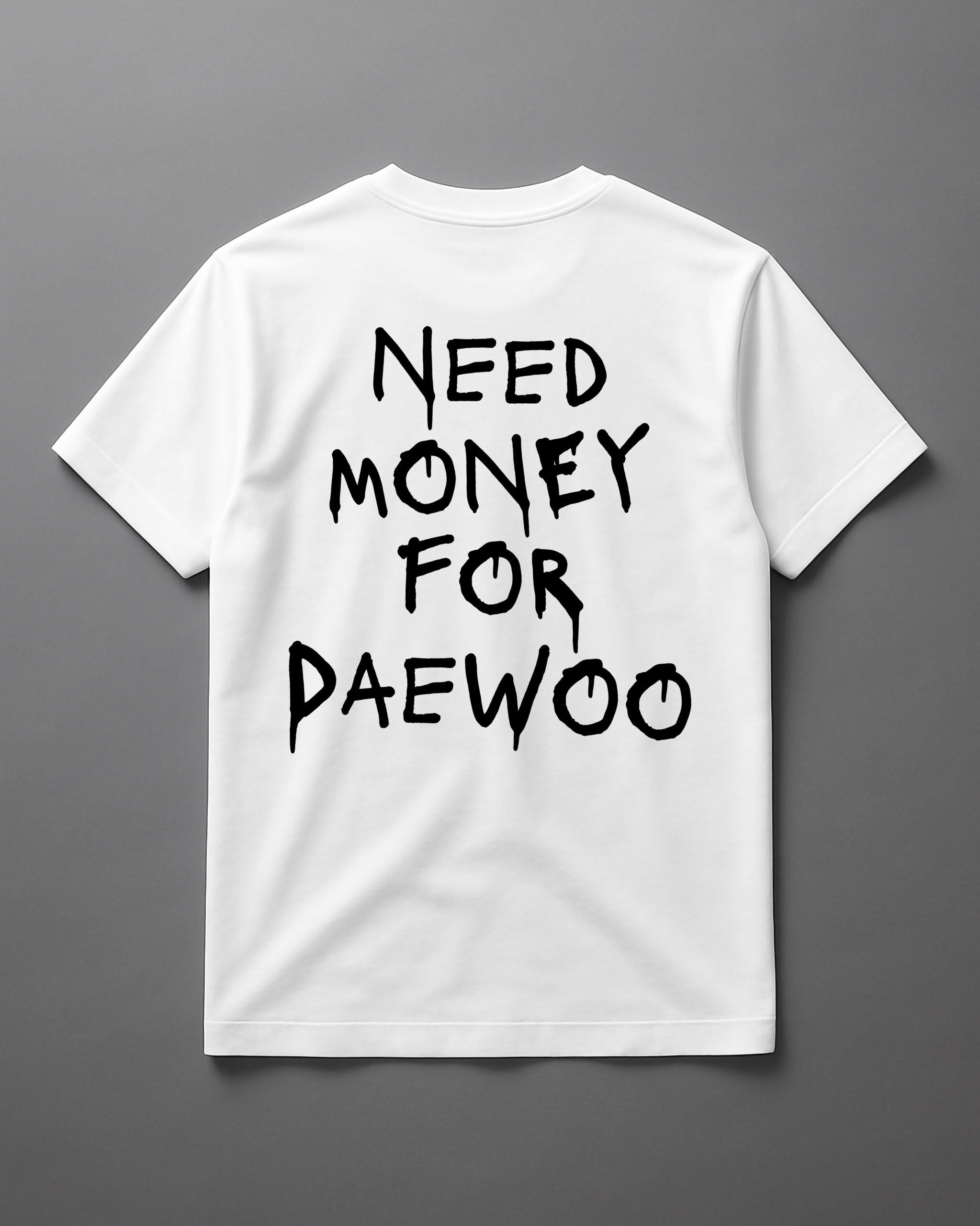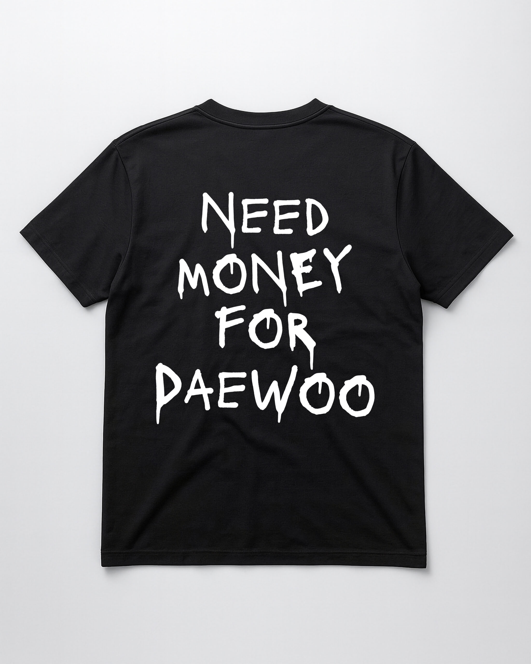 Koszulka Need Money For Daewoo – autoironiczny hołd dla marki, która nauczyła pół kraju jeździć tanio, głośno i bez złudzeń, wzór celowo balansuje na granicy absurdu i nostalgii, a trwały nadruk DTF sprawia, że ten żart wytrzyma więcej prań niż przeciętne Daewoo napraw u mechanika.