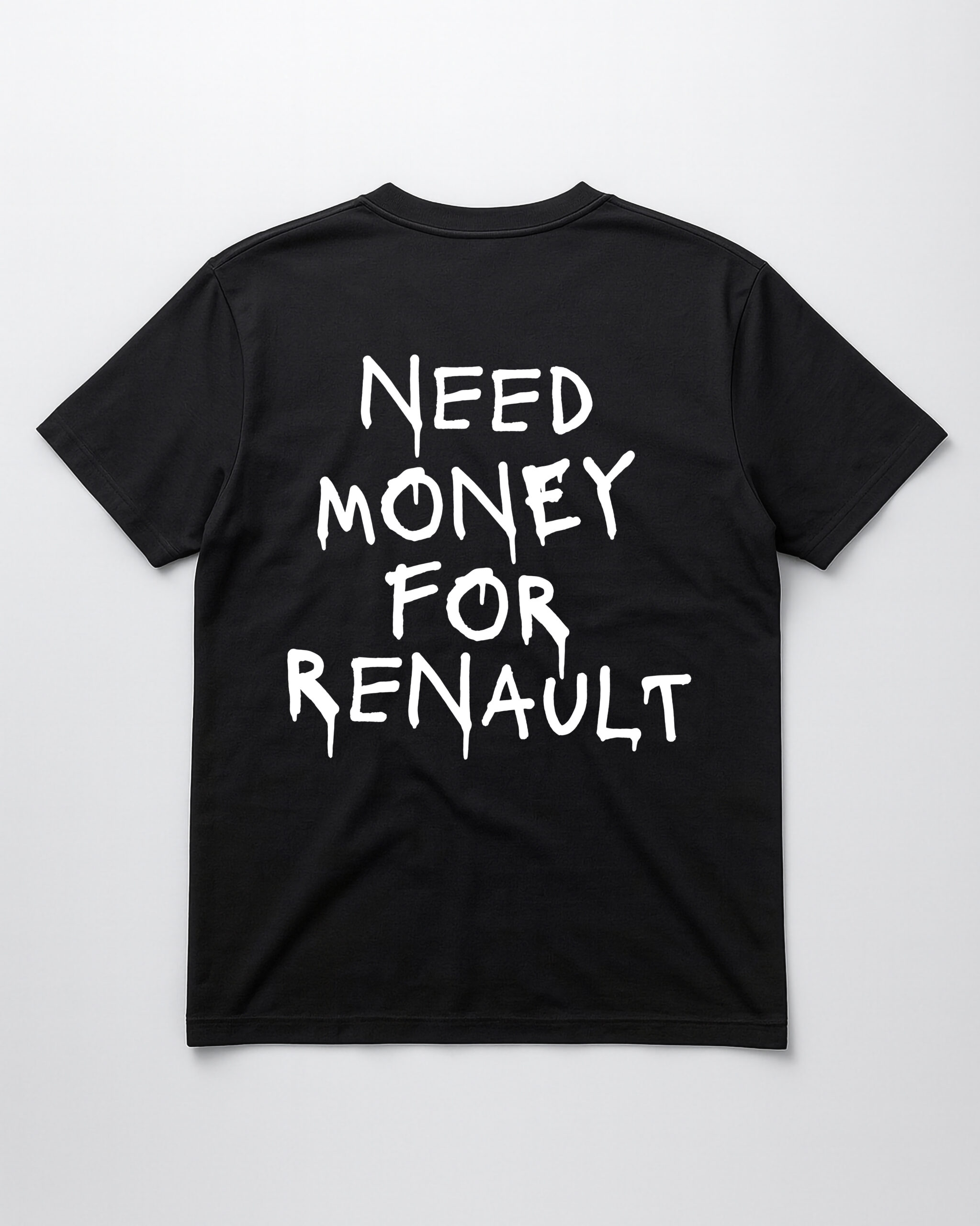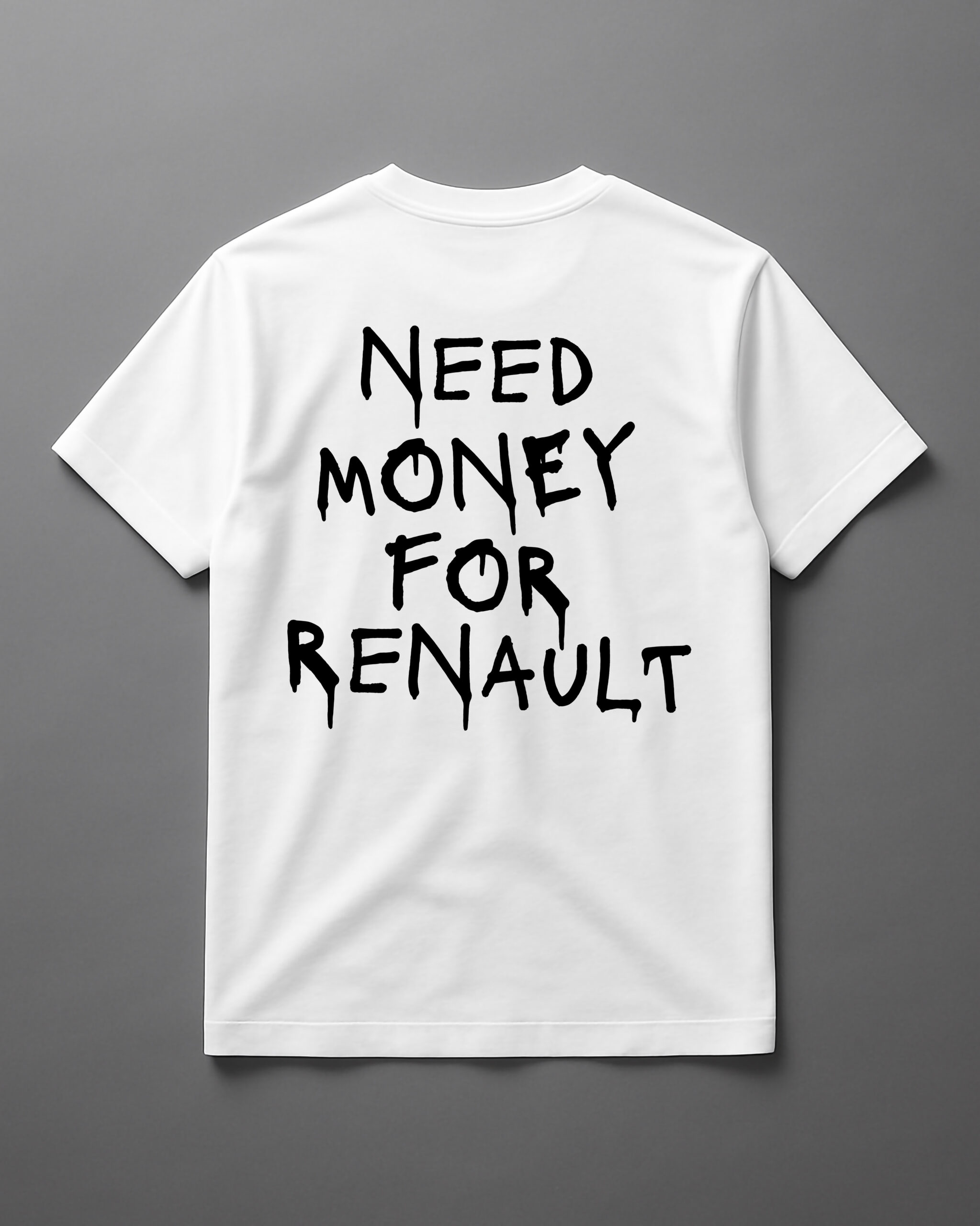 Koszulka Need Money for Renault to ironiczny motoryzacyjny statement dla fanów marki Renault, z wyrazistym napisem wykonanym w trwałej technologii DTF, dla tych, którzy wiedzą, że pasja do czterech kółek zawsze kosztuje.